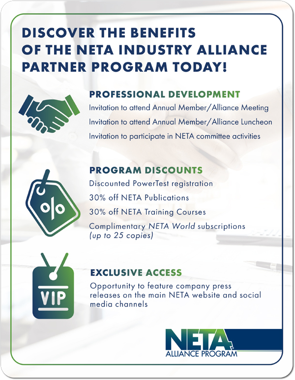 One of the many benefits offered by the Industry Alliance Program is the opportunity to participate in NETA working committee activities. Interested parties should click here to complete the application and submit it to the NETA office for consideration.